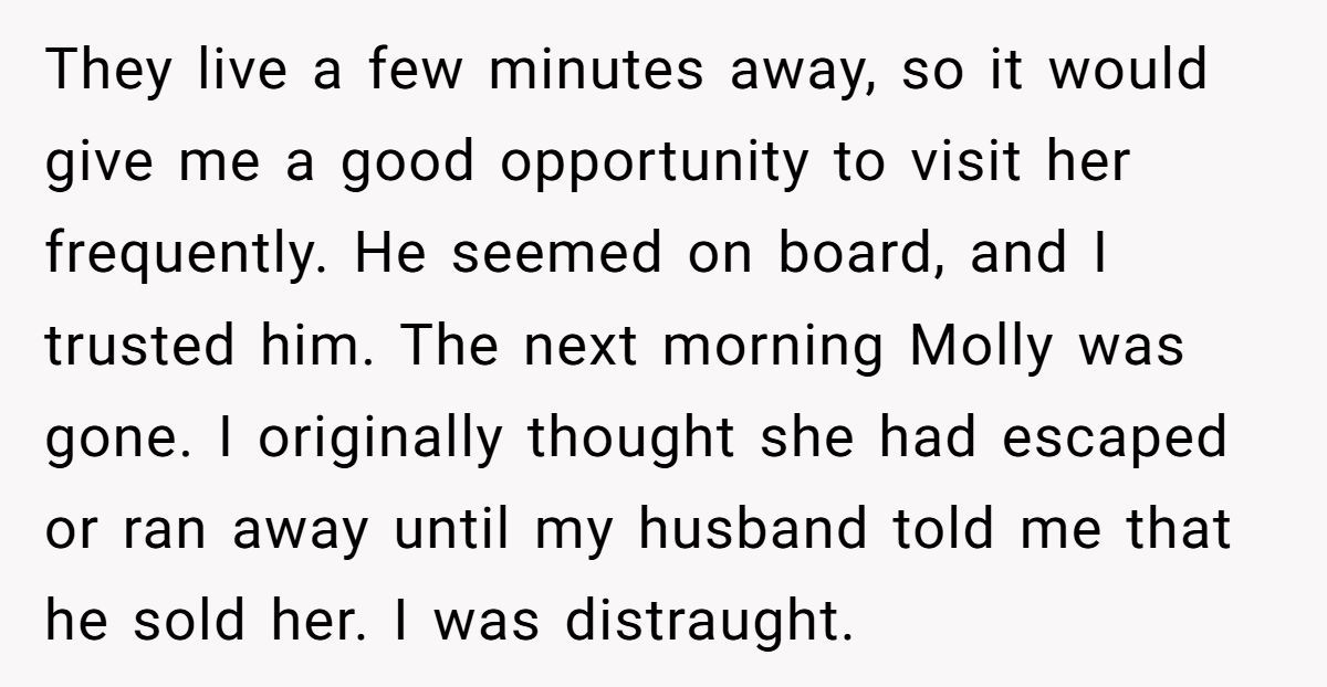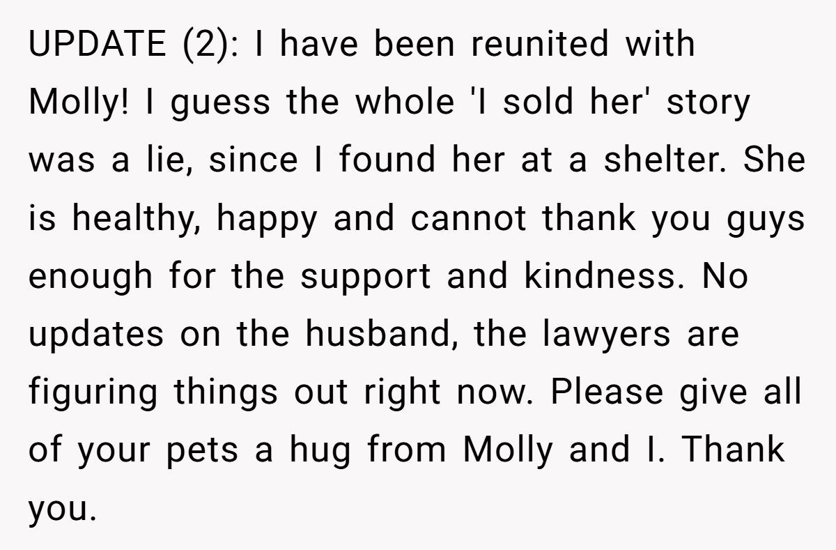 Commenters celebrated Molly’s reunion, sharing stories of similar pet betrayals and urging vigilance about the buyer’s intentions