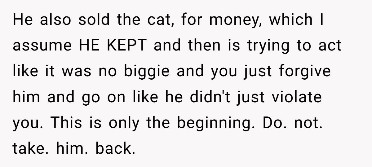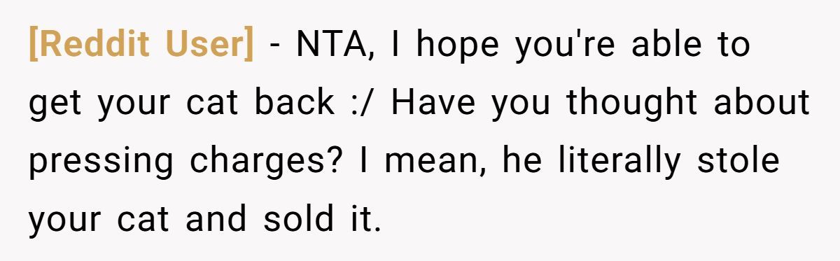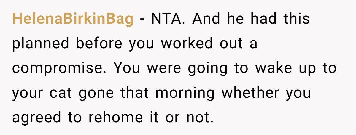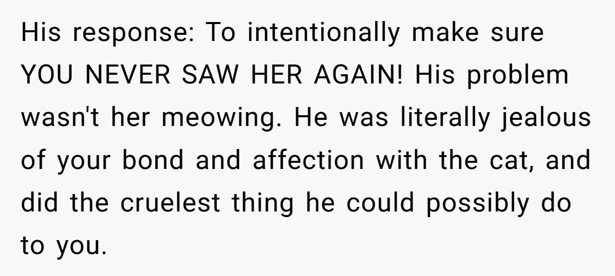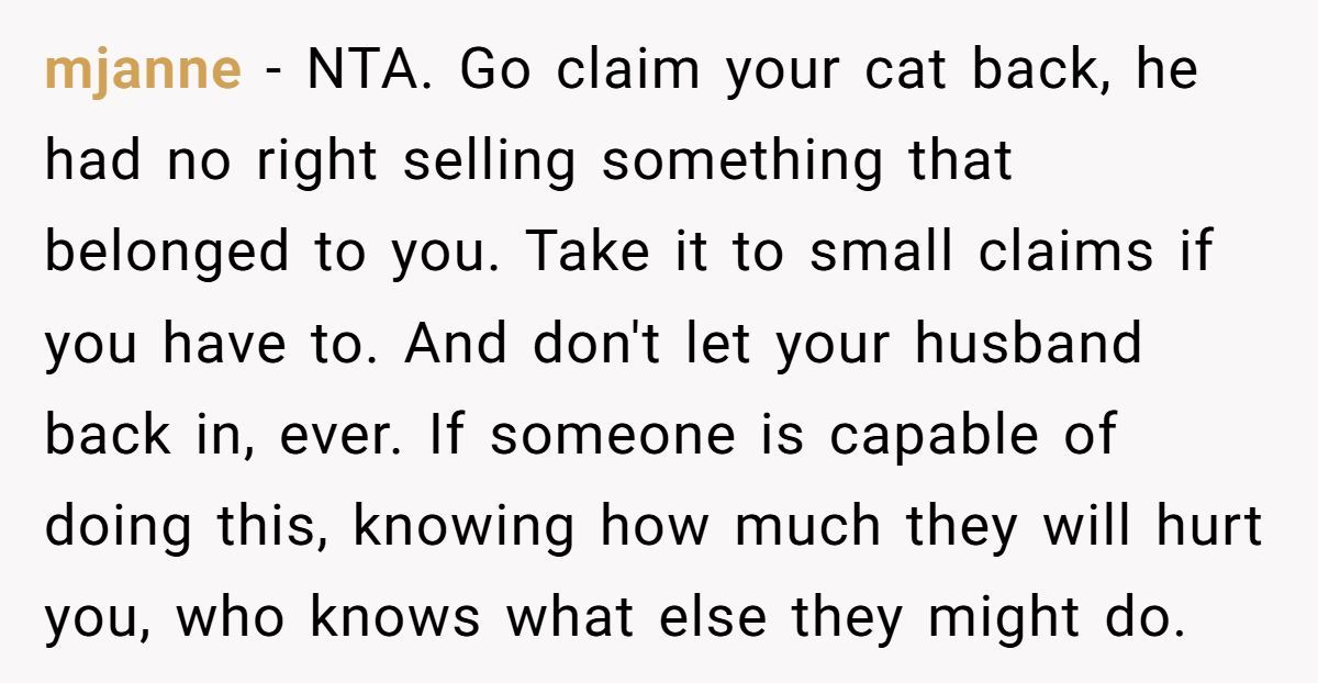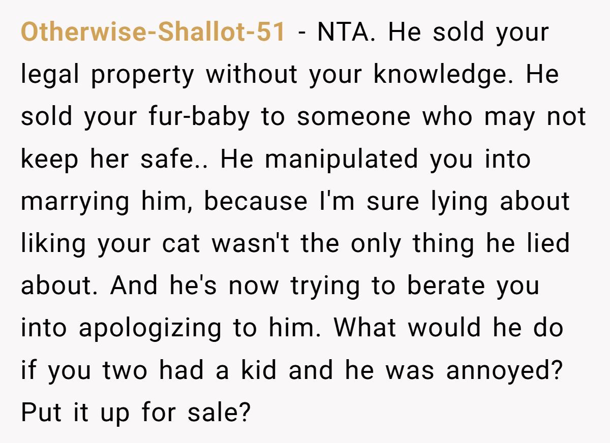 When a partner crosses the line from annoyance to betrayal, it’s not just about cats—it’s about character. Selling someone’s pet behind their back and then lying about it shows a disturbing lack of empathy and control. OP did more than just save her cat—she saved herself.