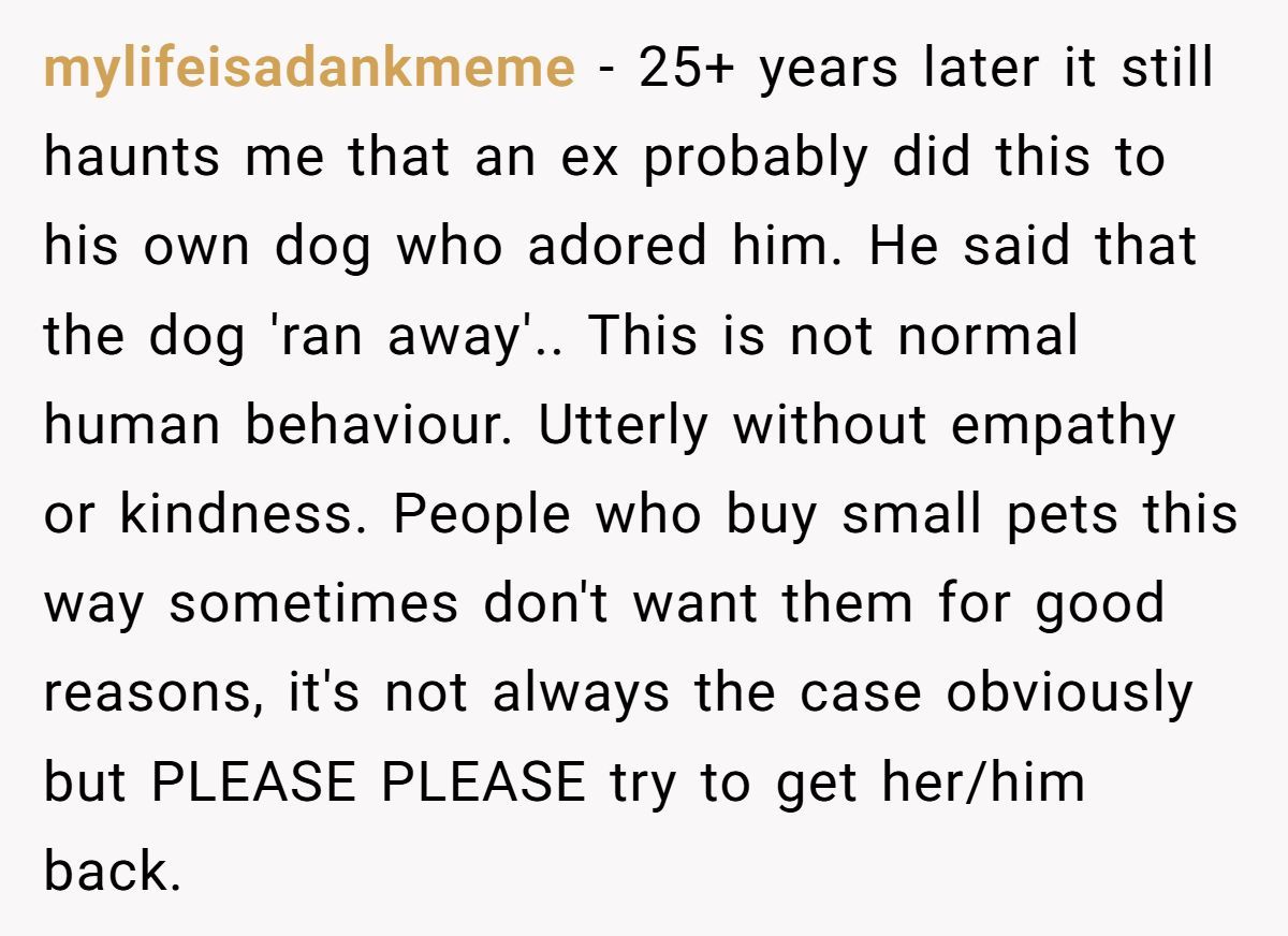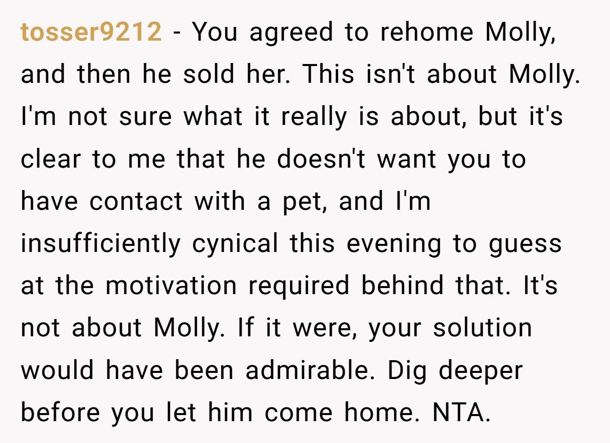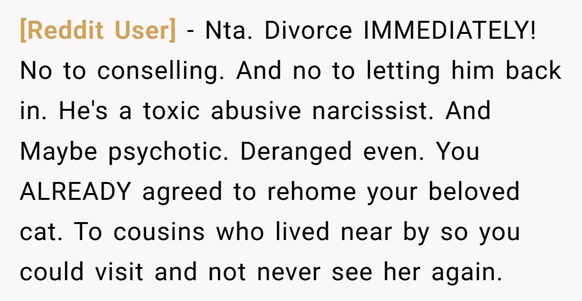 Pets are considered personal property in legal terms, but emotionally, they’re often seen as family. The trauma of losing a pet this way isn’t just about the loss—it’s about the control, the manipulation, and the loss of trust. What this Redditor experienced isn’t just a marital disagreement—it’s an erosion of autonomy and emotional safety.