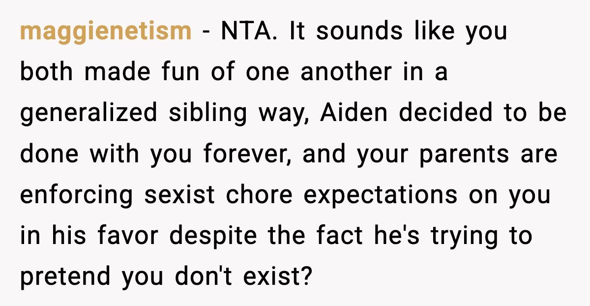 What makes this situation more concerning is the gender dynamic. She mentions being expected to clean for her brother—who won’t even speak to her. As sociologist Dr. Jessica McCrory Calarco notes in The New York Times, “Families often assign girls invisible labor, like cleaning and emotional caretaking, even when they’re not in the wrong.”