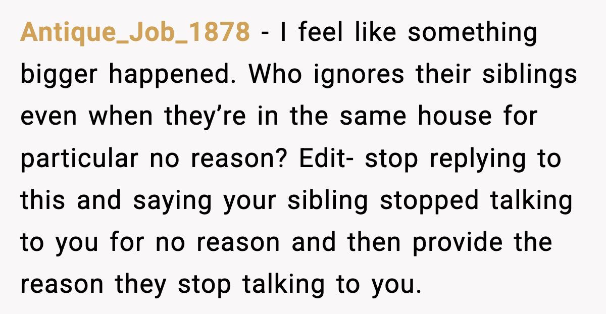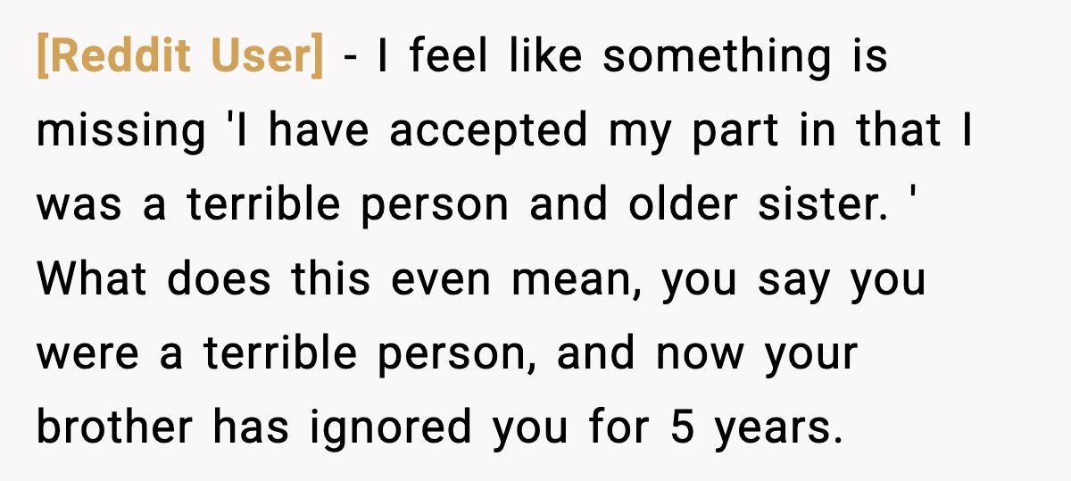 The estrangement between the siblings didn’t happen overnight. The Redditor admits to past mistakes, acknowledging the hurt she caused and her attempts to reconcile. But her brother’s refusal to engage—and his passive hostility when they did cross paths—paint a picture of unresolved trauma. As family therapist Dr. Jeanne Safer says in an article for Psychology Today, “Family estrangement is not necessarily toxic—it can be a way to protect the self from long-term emotional harm.”