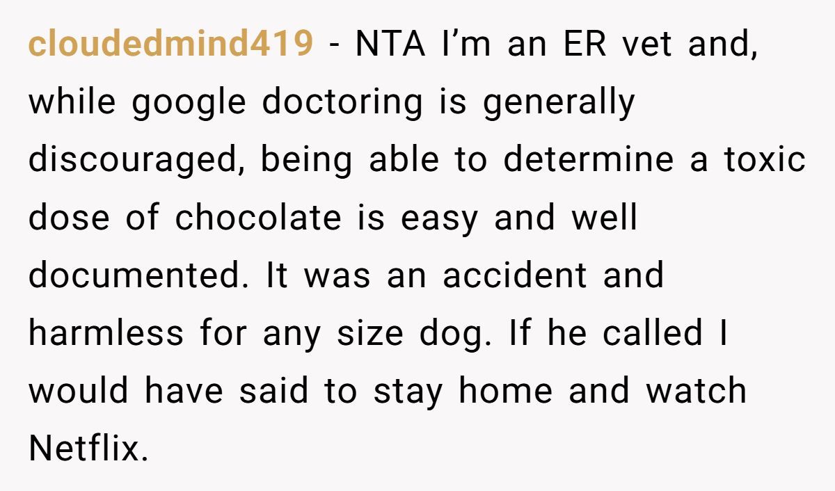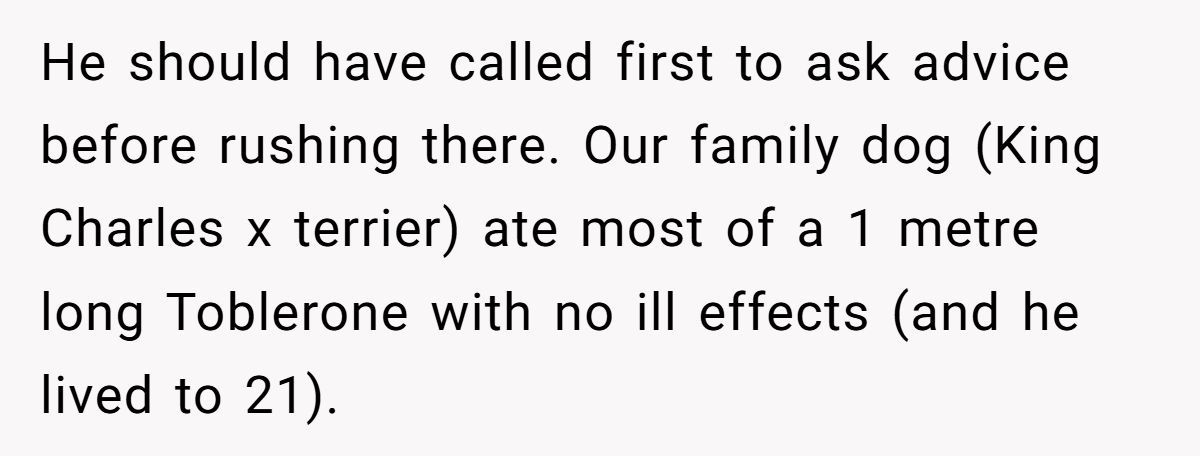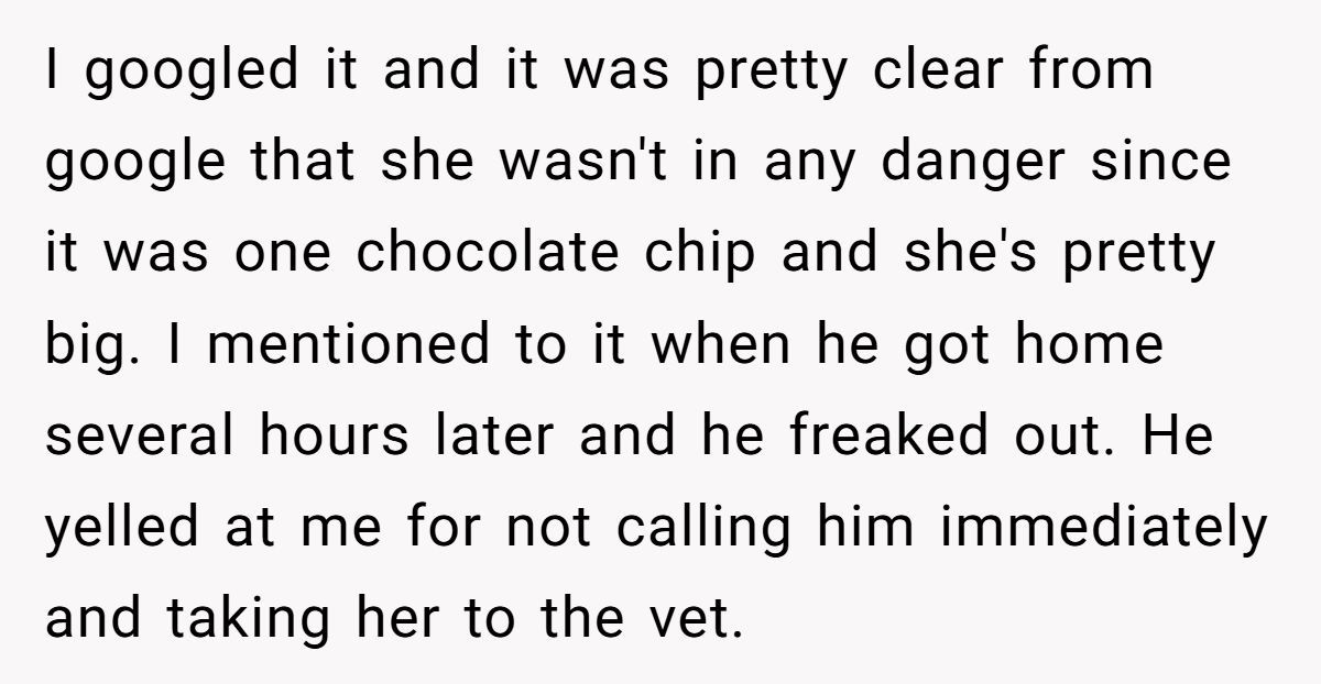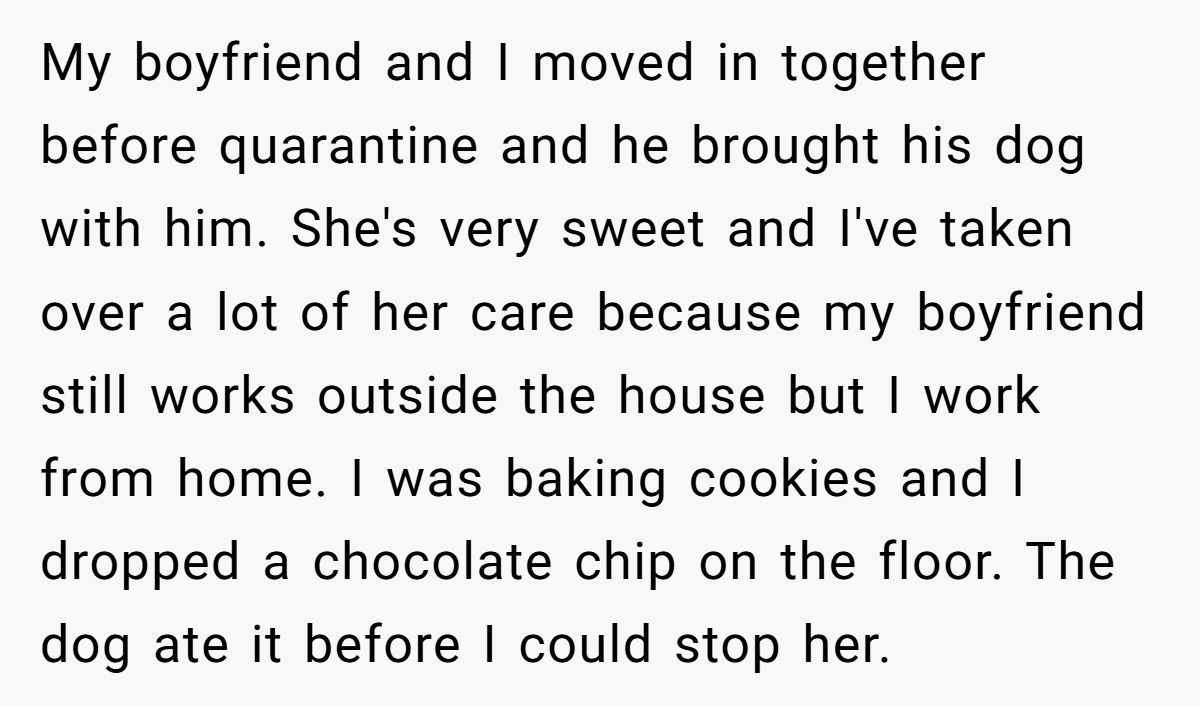 In a post that quickly turned Reddit into a pet-parent courtroom, a woman shared how she accidentally dropped a chocolate chip while baking. Her boyfriend’s dog snagged it—one single chip. She did what most would do: checked Google, confirmed the dog was fine, and kept baking. But when her boyfriend came home hours later, he launched into full panic mode and rushed the pup to the vet.