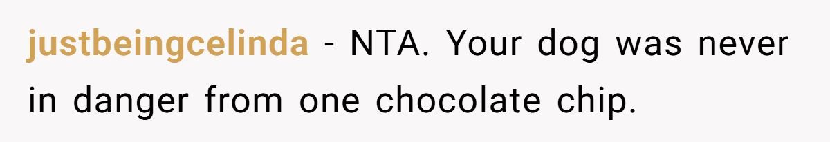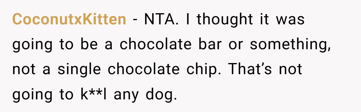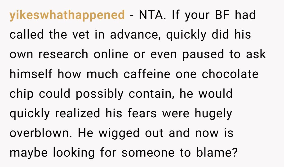 This drama wasn’t about a chocolate chip. It was about trust, communication, and whether your partner makes you responsible for their reactions. The dog? She was fine. But the boyfriend’s insistence that someone else should cover his anxiety bill? Not so fine.