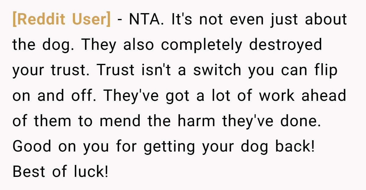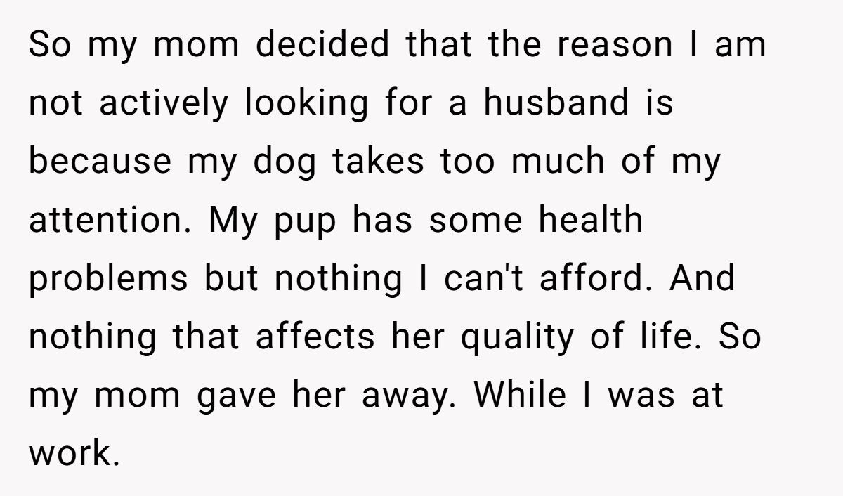 Ever had your trust shattered by the people closest to you? That’s the heartbreak one Redditor faced when her parents gave away her beloved dog while she was at work, claiming it was holding her back from finding a husband.