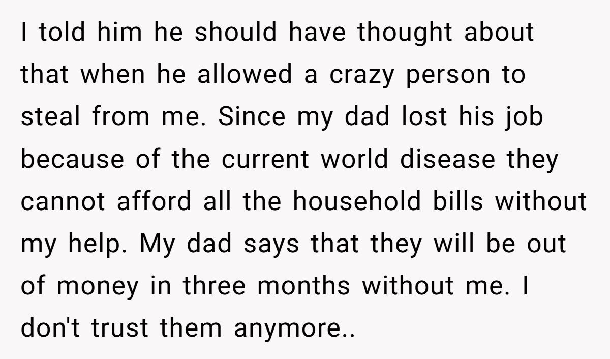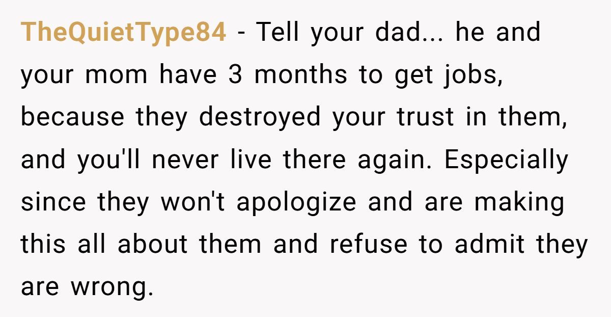 Commenters stressed her parents, not her, are responsible for their finances, suggesting they rent out her room or get jobs to cope
