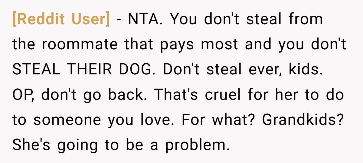 But was her response too extreme? Not according to family therapist Dr. Jenn Mann, who told Psychology Today, “If a family member crosses a personal boundary that is core to your emotional well-being, it’s reasonable to protect yourself by withdrawing support.” Rehoming the dog wasn’t a mistake—it was a boundary violation cloaked in parental concern.