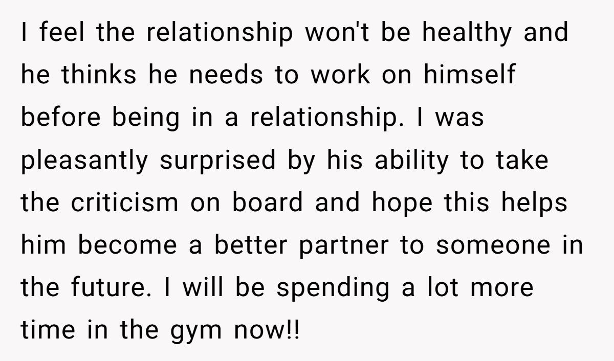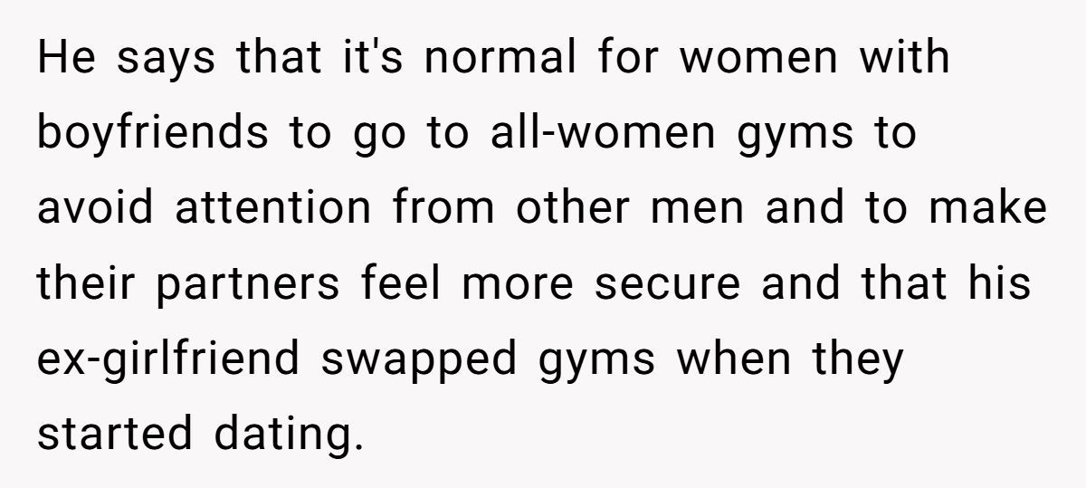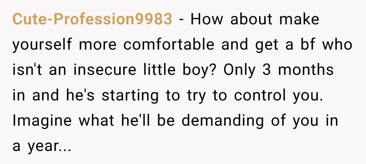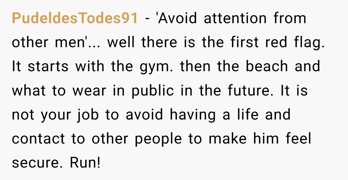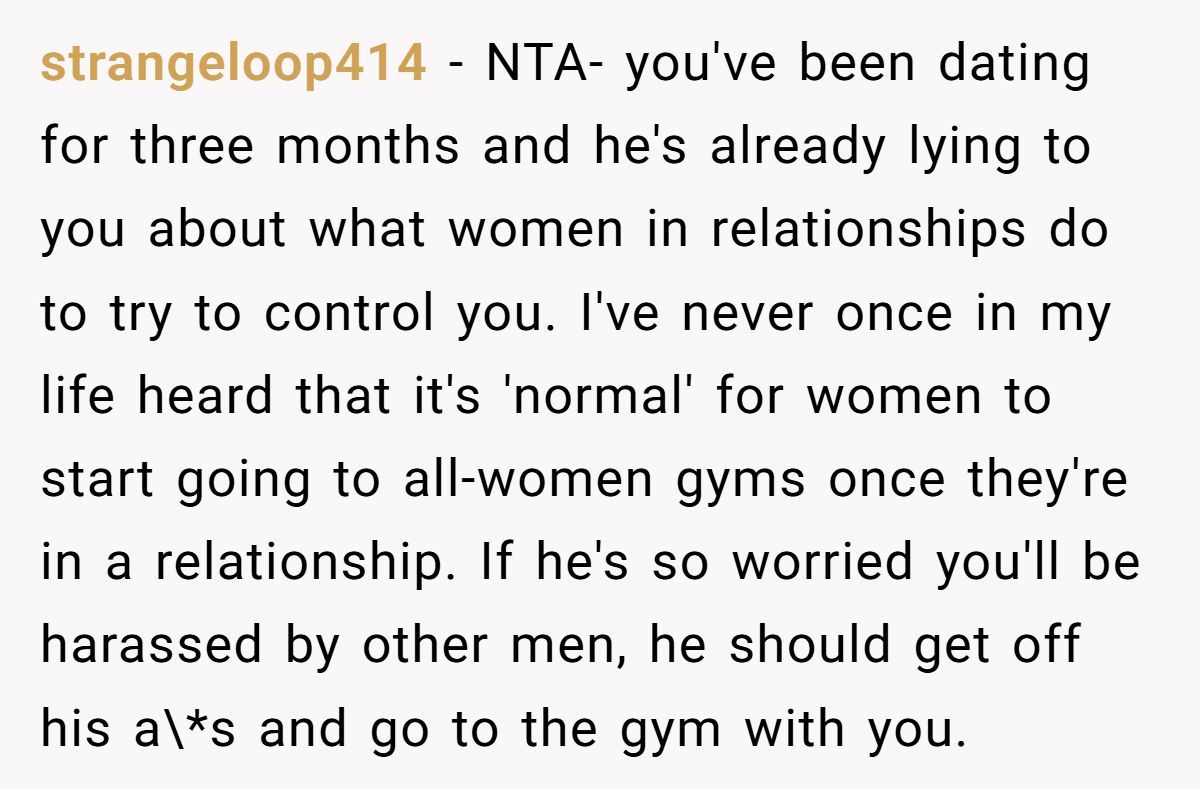 Here, the boyfriend insisted his partner change gyms simply to make him feel “more secure.” Yet trust should be the foundation of security, not surveillance. Telling someone to rearrange their lifestyle based on hypotheticals—especially after only three months—isn’t a sign of emotional maturity. It’s a warning shot.