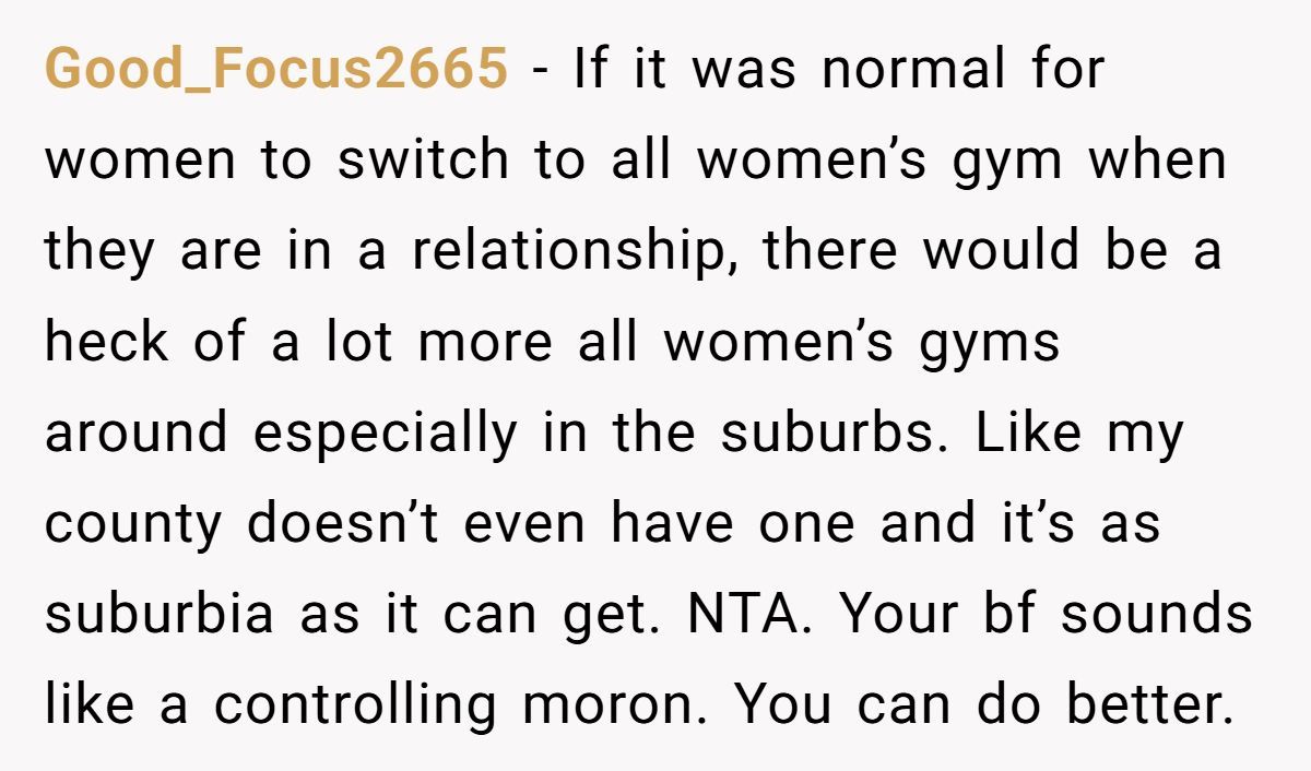 This commenter supported the woman’s autonomy, praising her refusal to change her gym routine for her boyfriend