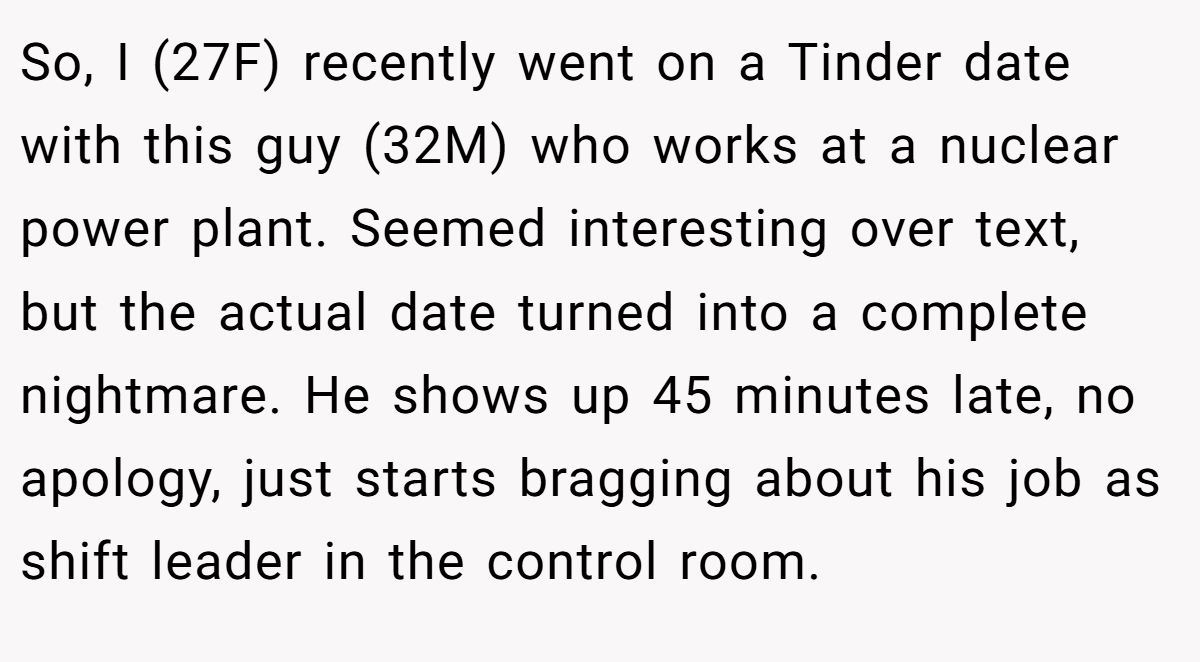 So, I (27F) recently went on a Tinder date with this guy (32M) who works at a nuclear power plant. Seemed interesting over text, but the actual date turned into a complete nightmare. He shows up 45 minutes late, no apology, just starts bragging about his job as shift leader in the control room.