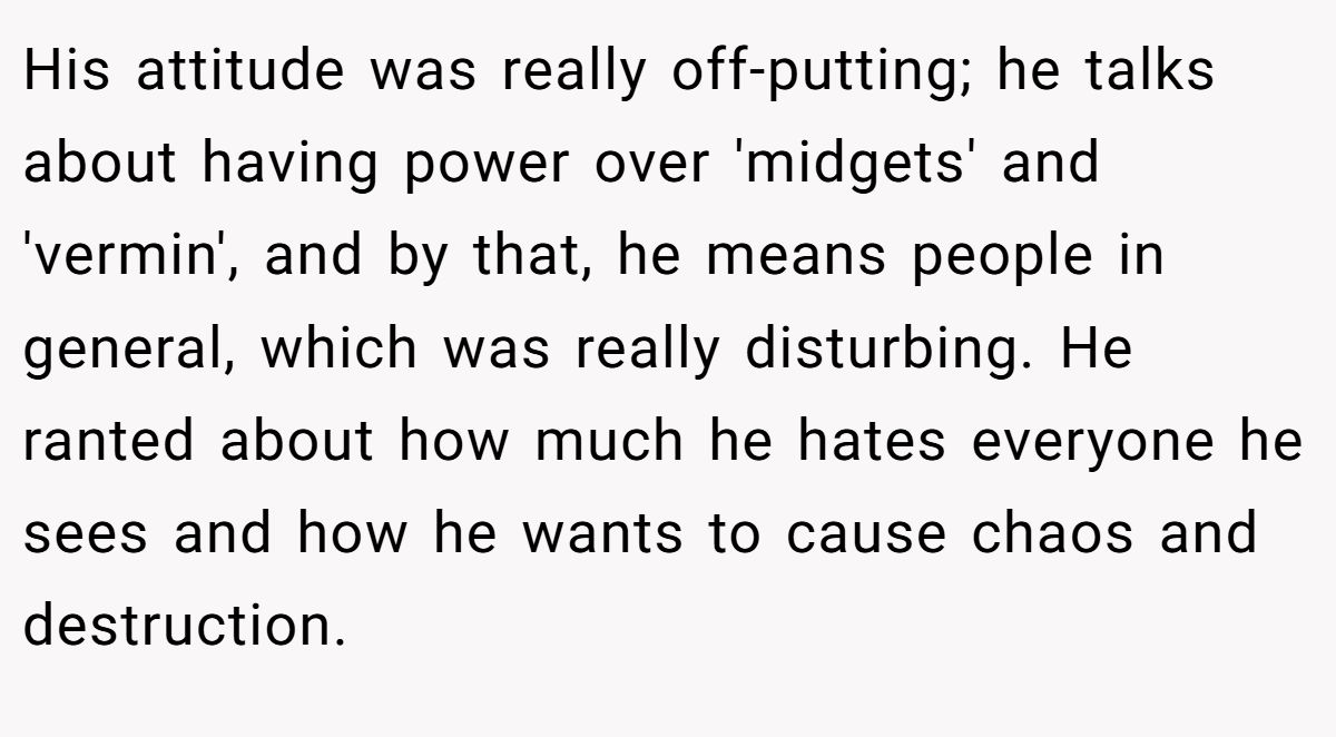His attitude was really off-putting; he talks about having power over 'midgets' and 'vermin', and by that, he means people in general, which was really disturbing. He ranted about how much he hates everyone he sees and how he wants to cause chaos and destruction.