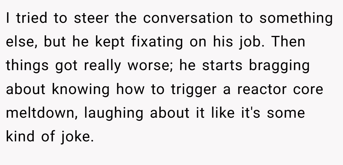I tried to steer the conversation to something else, but he kept fixating on his job. Then things got really worse; he starts bragging about knowing how to trigger a reactor core meltdown, laughing about it like it's some kind of joke.