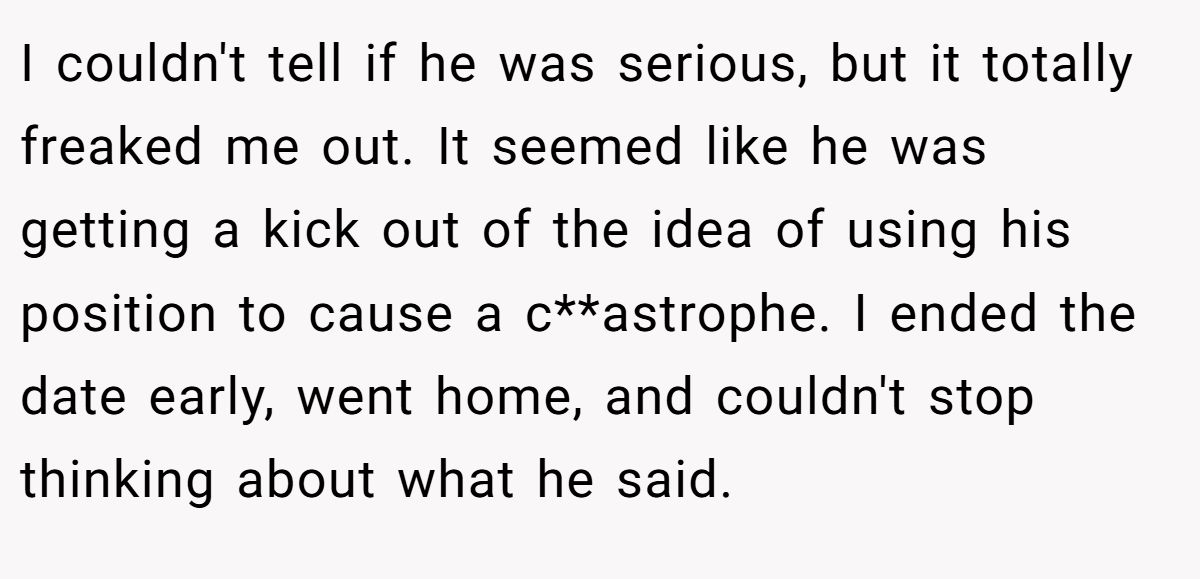 I couldn't tell if he was serious, but it totally freaked me out. It seemed like he was getting a kick out of the idea of using his position to cause a c**astrophe. I ended the date early, went home, and couldn't stop thinking about what he said.