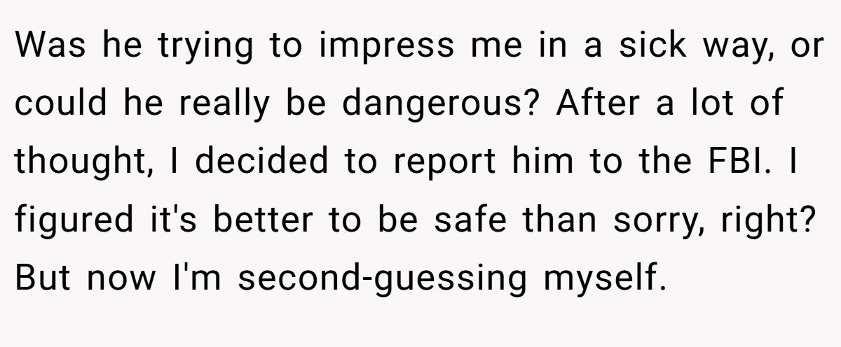 Was he trying to impress me in a sick way, or could he really be dangerous? After a lot of thought, I decided to report him to the FBI. I figured it's better to be safe than sorry, right? But now I'm second-guessing myself.
