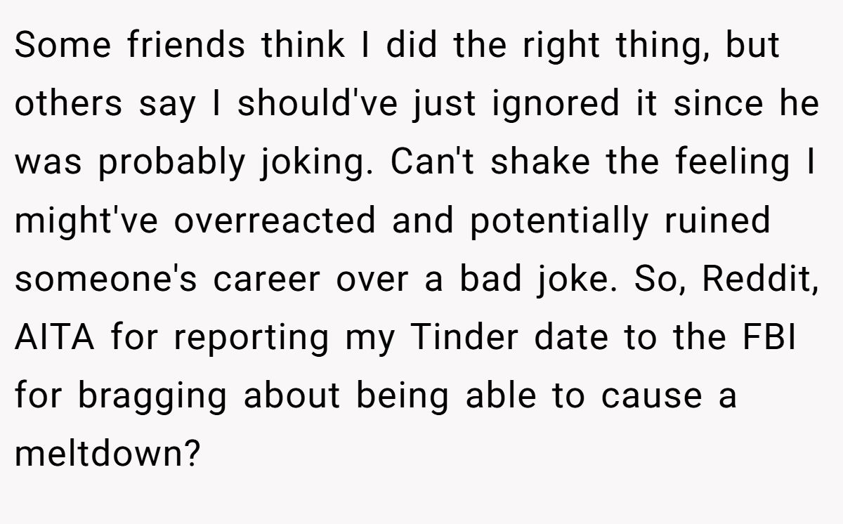 Some friends think I did the right thing, but others say I should've just ignored it since he was probably joking. Can't shake the feeling I might've overreacted and potentially ruined someone's career over a bad joke. So, Reddit, AITA for reporting my Tinder date to the FBI for bragging about being able to cause a meltdown?