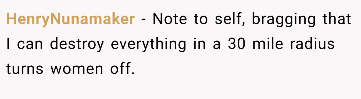 This Redditor noted that boasting about mass destruction isn’t exactly a dating win.