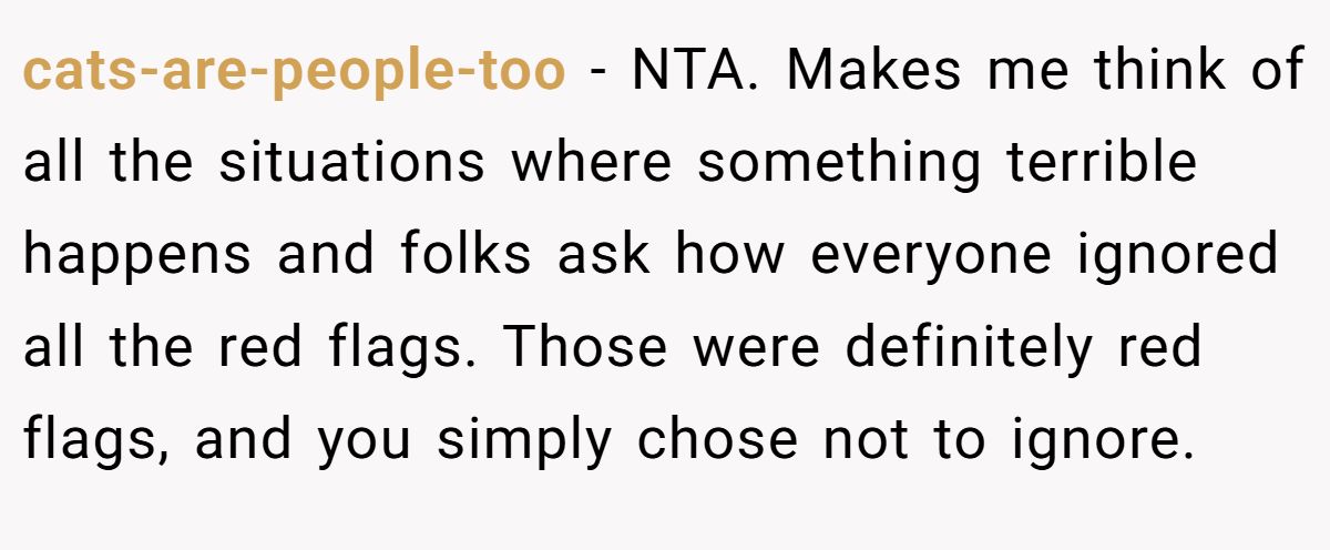cats-are-people-too − NTA. Makes me think of all the situations where something terrible happens and folks ask how everyone ignored all the red flags. Those were definitely red flags, and you simply chose not to ignore.