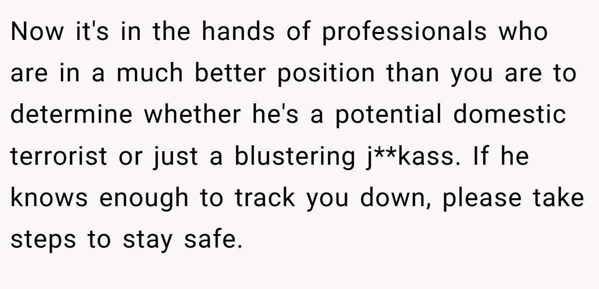 Another user stressed the danger of ignoring red flags—professionals can assess whether it’s a real threat or just hot air.