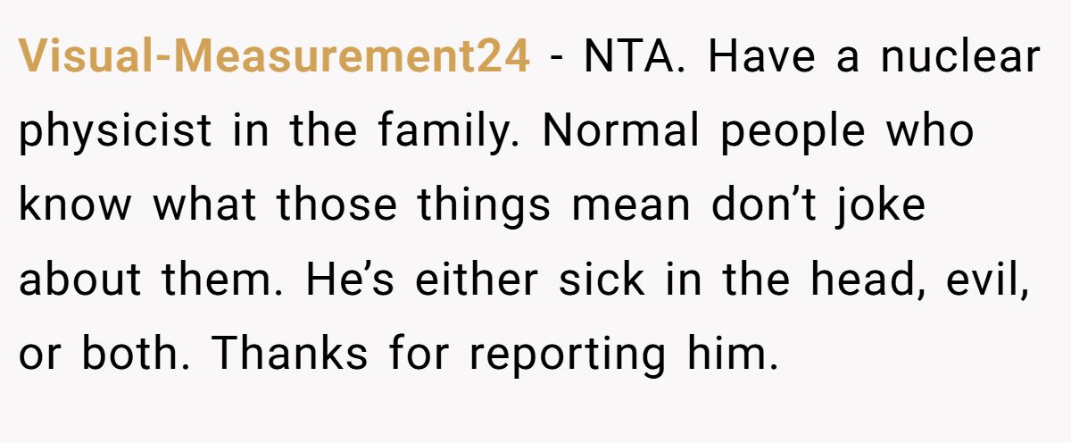 Visual-Measurement24 − NTA. Have a nuclear physicist in the family. Normal people who know what those things mean don’t joke about them. He’s either sick in the head, evil, or both. Thanks for reporting him.