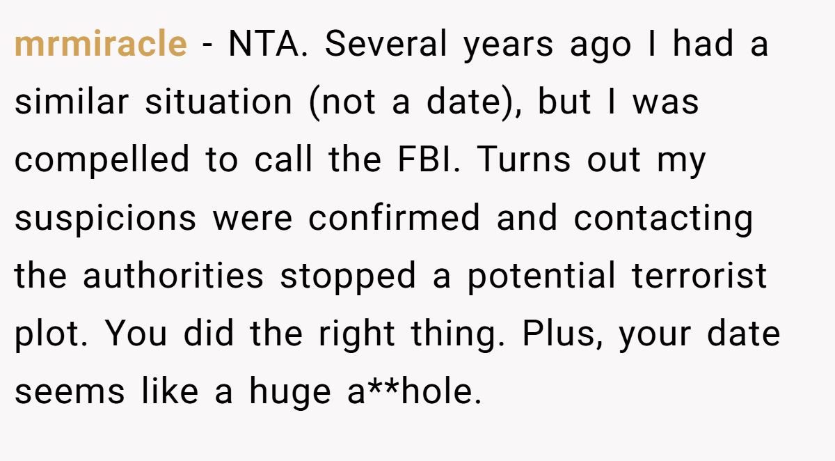 First dates are already stressful enough without your dinner companion joking about ending civilization. In this story, the Redditor walked out not just with disappointment—but with a gut-level fear that led her straight to the FBI.