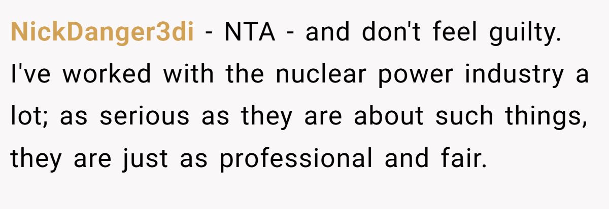 NickDanger3di − NTA - and don't feel guilty. I've worked with the nuclear power industry a lot; as serious as they are about such things, they are just as professional and fair.