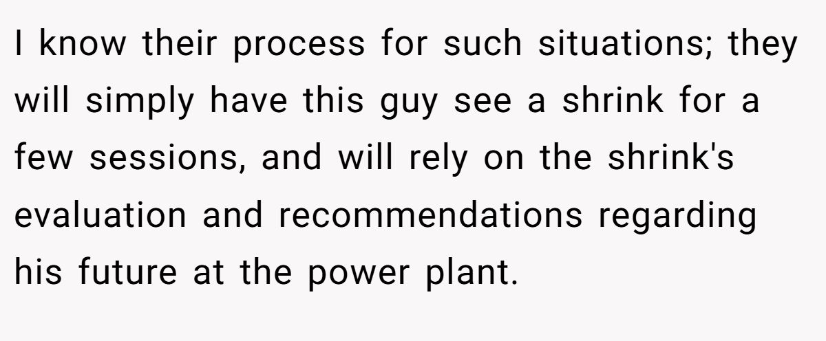 I know their process for such situations; they will simply have this guy see a shrink for a few sessions, and will rely on the shrink's evaluation and recommendations regarding his future at the power plant.