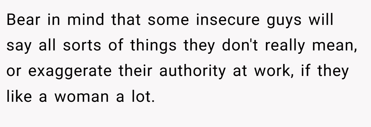 Bear in mind that some insecure guys will say all sorts of things they don't really mean, or exaggerate their authority at work, if they like a woman a lot.