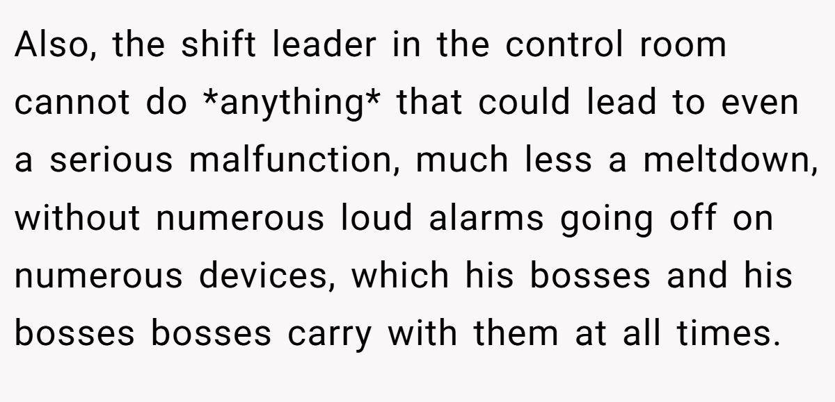 Also, the shift leader in the control room cannot do *anything* that could lead to even a serious malfunction, much less a meltdown, without numerous loud alarms going off on numerous devices, which his bosses and his bosses bosses carry with them at all times.