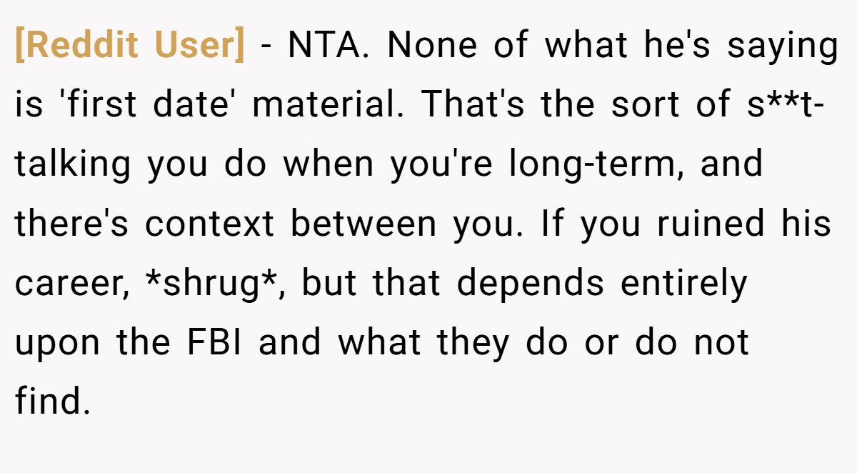 [Reddit User] − NTA. None of what he's saying is 'first date' material. That's the sort of s**t-talking you do when you're long-term, and there's context between you. If you ruined his career, *shrug*, but that depends entirely upon the FBI and what they do or do not find.