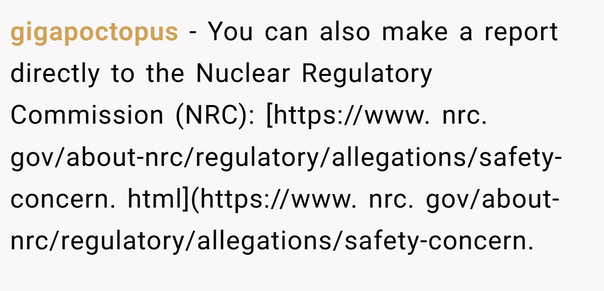 gigapoctopus − You can also make a report directly to the Nuclear Regulatory Commission (NRC): [https://www. nrc. gov/about-nrc/regulatory/allegations/safety-concern. html](https://www. nrc. gov/about-nrc/regulatory/allegations/safety-concern.