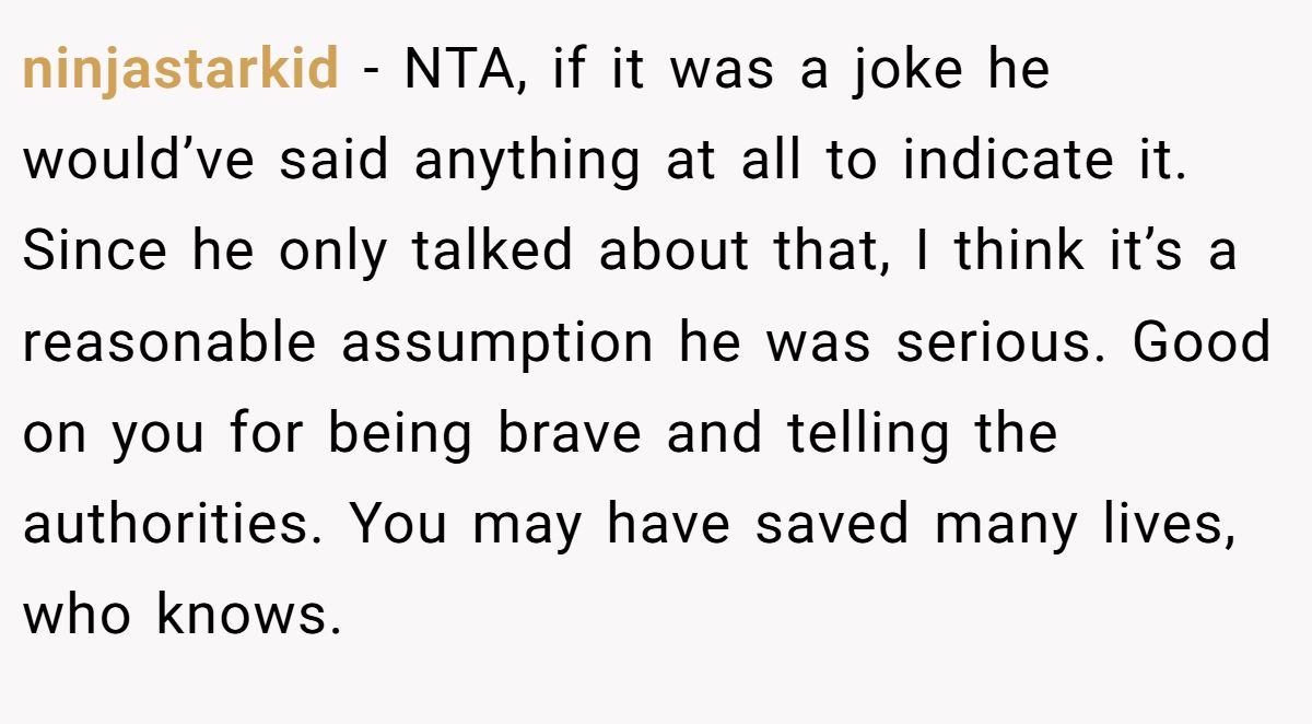 ninjastarkid − NTA, if it was a joke he would’ve said anything at all to indicate it. Since he only talked about that, I think it’s a reasonable assumption he was serious. Good on you for being brave and telling the authorities. You may have saved many lives, who knows.