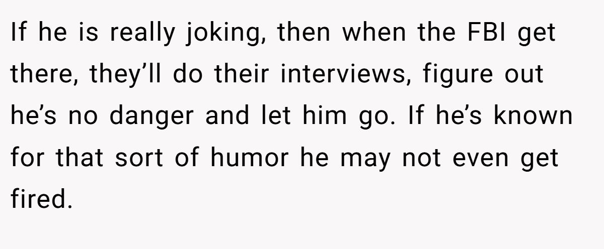 If he is really joking, then when the FBI get there, they’ll do their interviews, figure out he’s no danger and let him go. If he’s known for that sort of humor he may not even get fired.