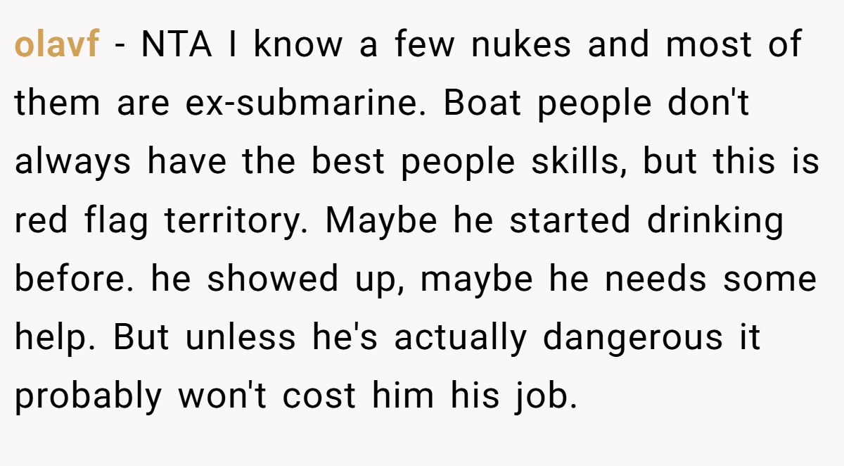 olavf − NTA I know a few nukes and most of them are ex-submarine. Boat people don't always have the best people skills, but this is red flag territory. Maybe he started drinking before. he showed up, maybe he needs some help. But unless he's actually dangerous it probably won't cost him his job.