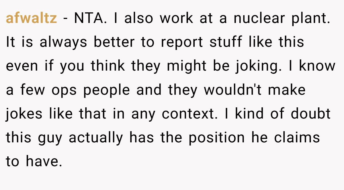 afwaltz − NTA. I also work at a nuclear plant. It is always better to report stuff like this even if you think they might be joking. I know a few ops people and they wouldn't make jokes like that in any context. I kind of doubt this guy actually has the position he claims to have.