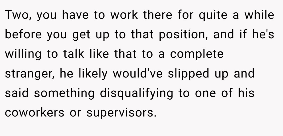 Two, you have to work there for quite a while before you get up to that position, and if he's willing to talk like that to a complete stranger, he likely would've slipped up and said something disqualifying to one of his coworkers or supervisors.