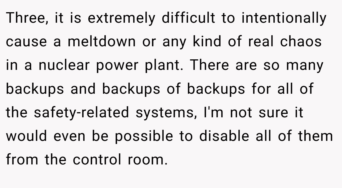 Three, it is extremely difficult to intentionally cause a meltdown or any kind of real chaos in a nuclear power plant. There are so many backups and backups of backups for all of the safety-related systems, I'm not sure it would even be possible to disable all of them from the control room.