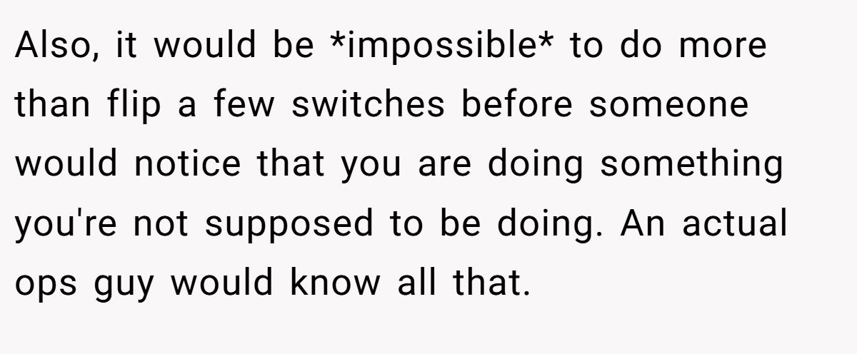 Also, it would be *impossible* to do more than flip a few switches before someone would notice that you are doing something you're not supposed to be doing. An actual ops guy would know all that.