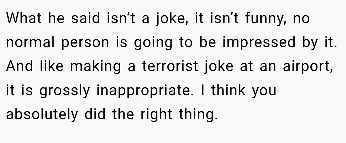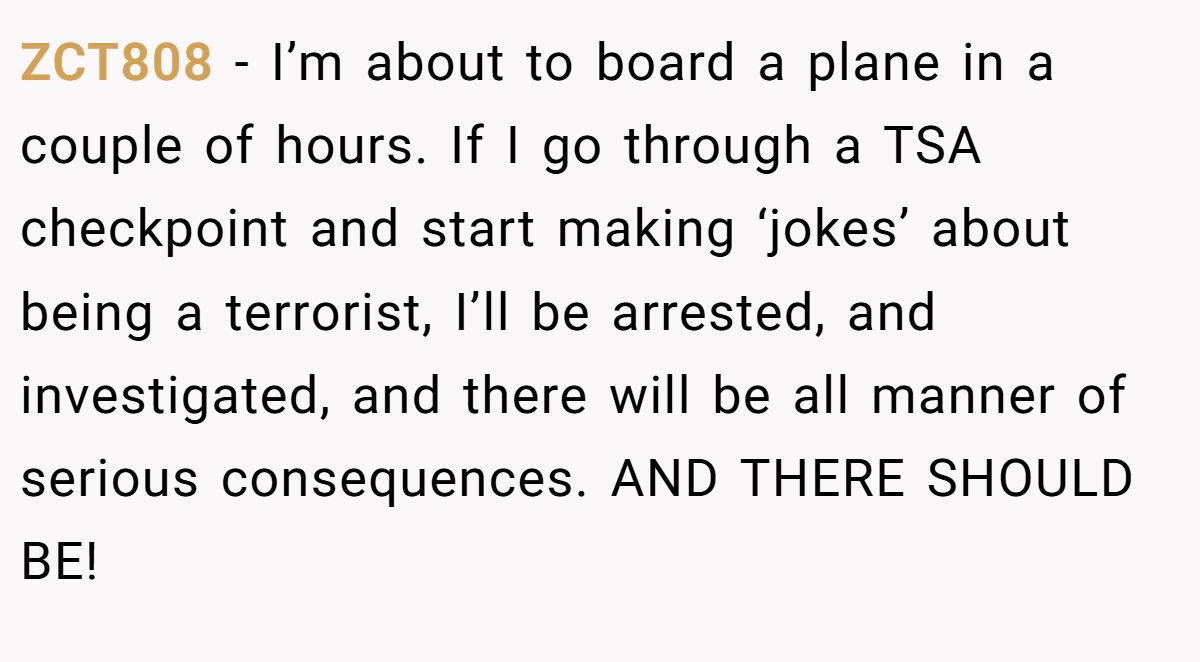 And finally, a Redditor compared the situation to joking about bombs in an airport: not funny, not smart, and definitely reportable.