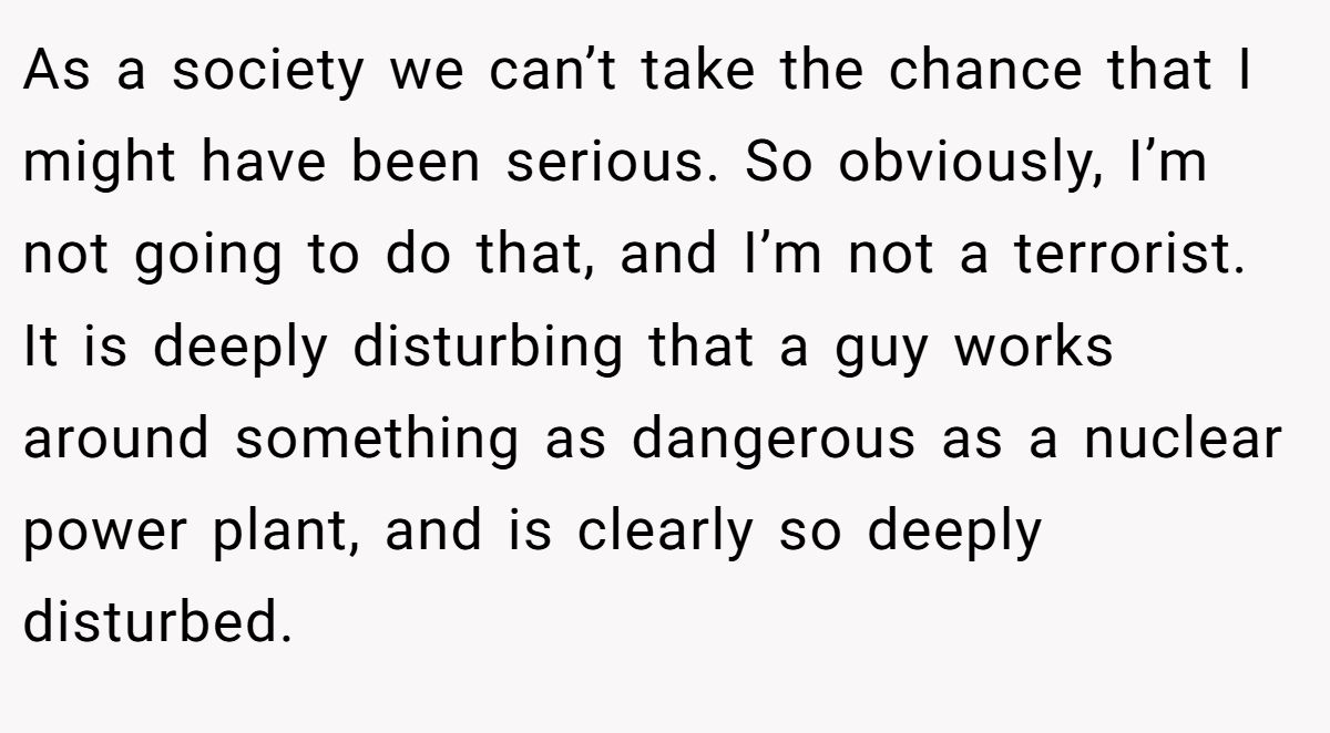 As a society we can’t take the chance that I might have been serious. So obviously, I’m not going to do that, and I’m not a terrorist. It is deeply disturbing that a guy works around something as dangerous as a nuclear power plant, and is clearly so deeply disturbed.