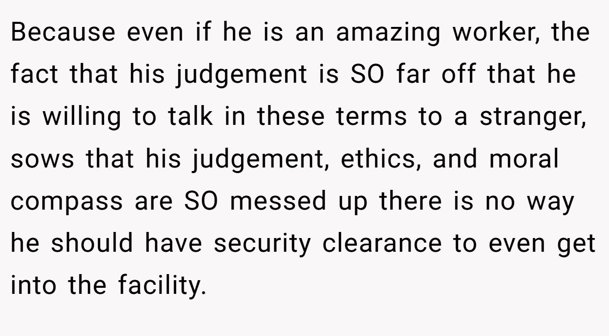 Because even if he is an amazing worker, the fact that his judgement is SO far off that he is willing to talk in these terms to a stranger, sows that his judgement, ethics, and moral compass are SO messed up there is no way he should have security clearance to even get into the facility.