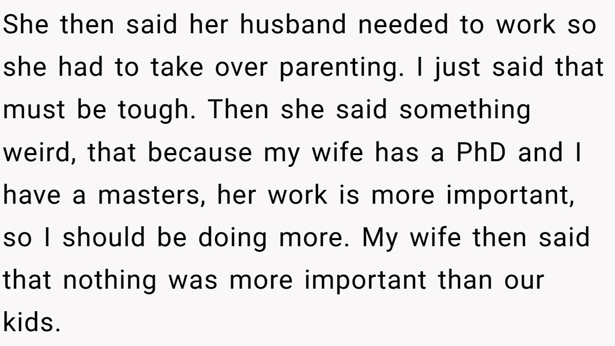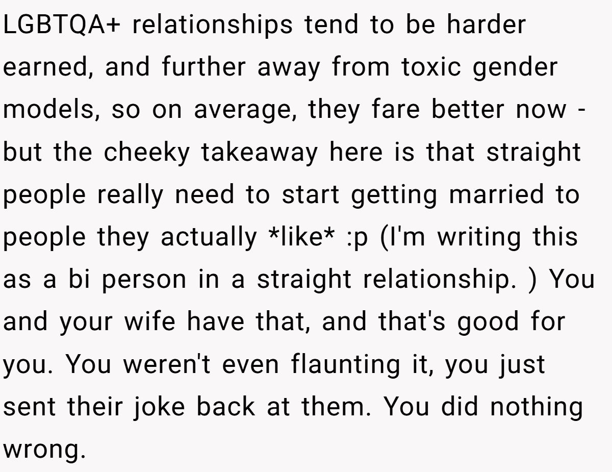 Reality supports that LGBTQ relationships often score higher in equity and satisfaction. A Pew Research survey released in June 2025 found that 92 percent of married same-s*x couples say their relationship is going “very well” or “fairly well,” compared with 55 percent of different-s*x couples in 2019. Another Pew report from 2021 shows that, in opposite-s*x households, 59 percent of women report doing more housework than their male partner, highlighting an enduring gender disparity. The Redditor’s partnership stands in clear contrast: shared parenting, shared chores, and no silent resentment.