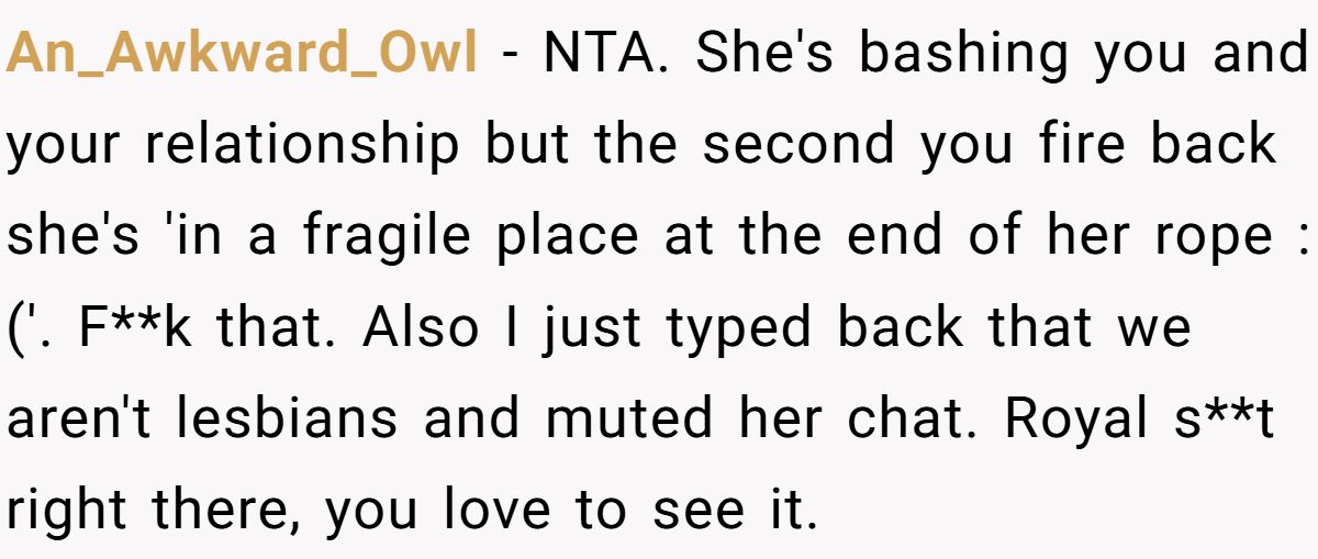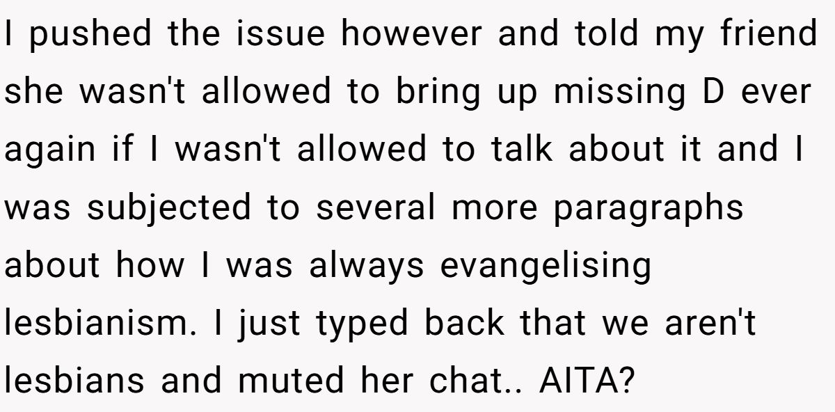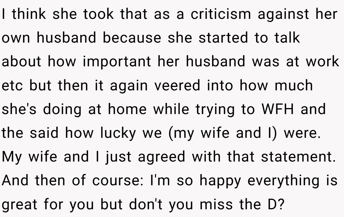 One Redditor found herself at the center of a late-night Zoom drama—sparked not by parenting woes or pandemic stress, but by one too many jokes about “missing the D.” You’d think after years of enduring suggestive jabs from her straight, married friends, she’d be used to it. But when the pressure finally popped, her response left one friend storming off and others gasping through their wine glasses.
