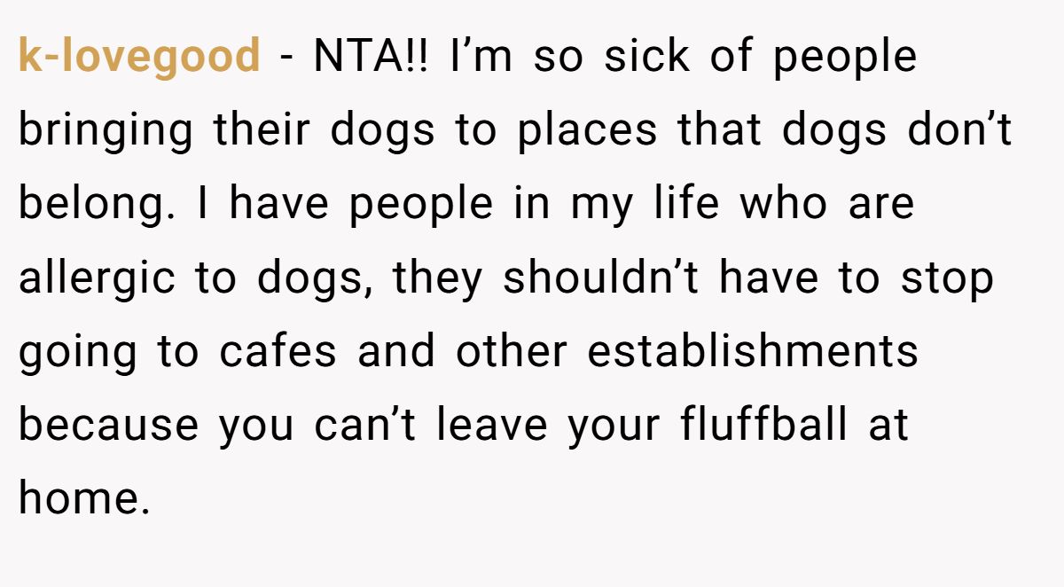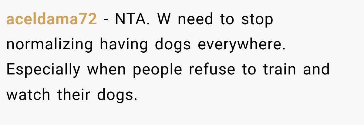 Aceldama72 slammed the trend of dogs in public spaces, siding with the Redditor.