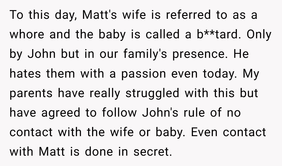 Clinical psychologist Dr. Harriet Lerner once said in Psychology Today, “Forgiveness is not a line you cross—it’s a path you walk.” That quote fits this family like a glove. John may never be ready to forgive, and that doesn’t make him immature—it makes him human. According to a 2020 study published in The Journal of Family Psychology, familial betrayal ranks among the top five emotional traumas requiring long-term healing.