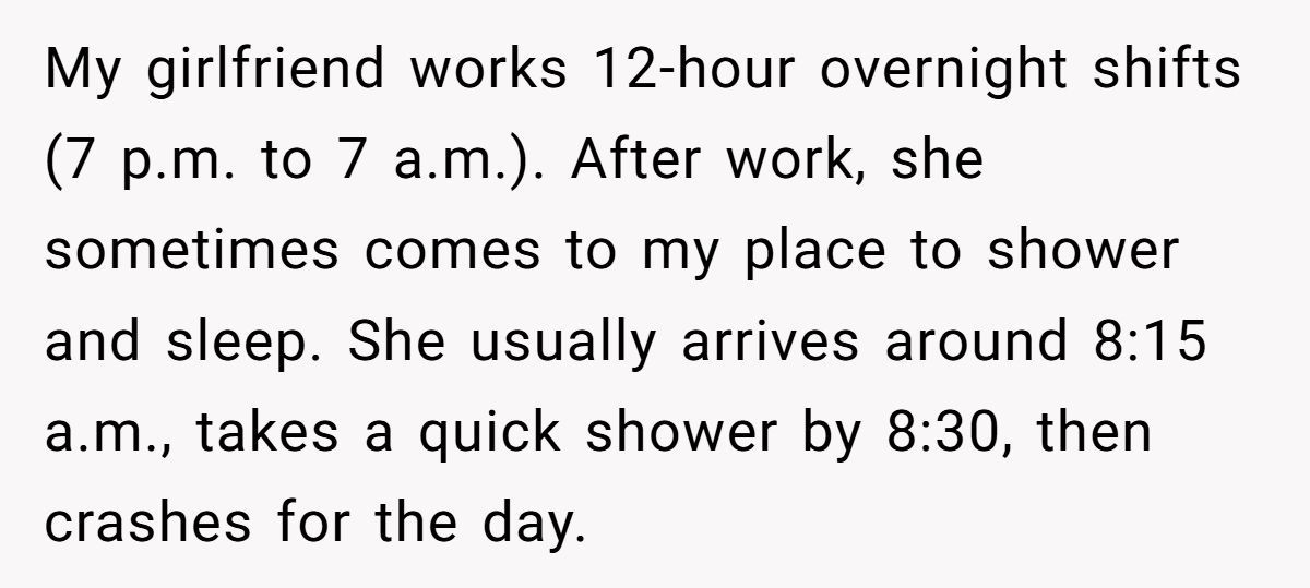 One man’s attempt to keep the peace backfired when his girlfriend stopped morning visits after a complaint about her post-shift showers disrupted the household