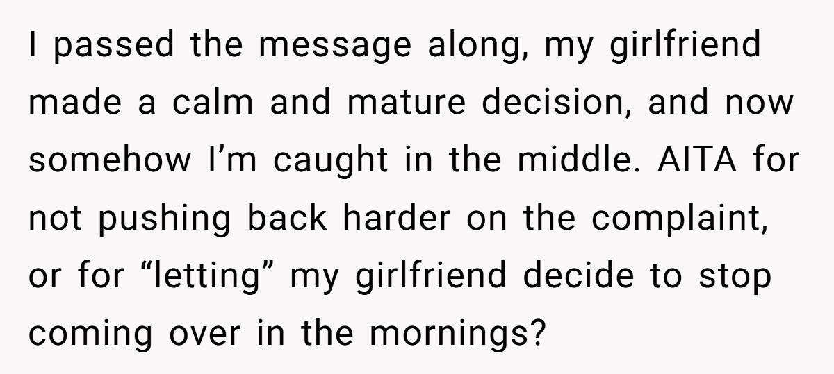 The girlfriend, understandably uncomfortable, chose to stop coming over in the mornings. No drama, no accusations. But somehow, that sparked even more drama—this time from the Redditor’s mother. Her beef? He “let” his girlfriend disappear without defending her. And now, his neutral stance is being labeled as betrayal. Want the juicy details? Dive into the original story below!