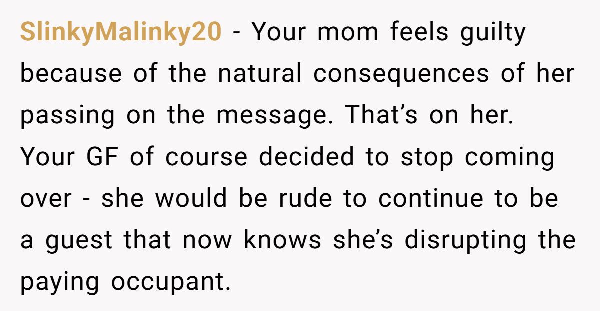 These Redditors supported the girlfriend’s decision to stop visiting, seeing it as a natural response to feeling disrespected in a shared home