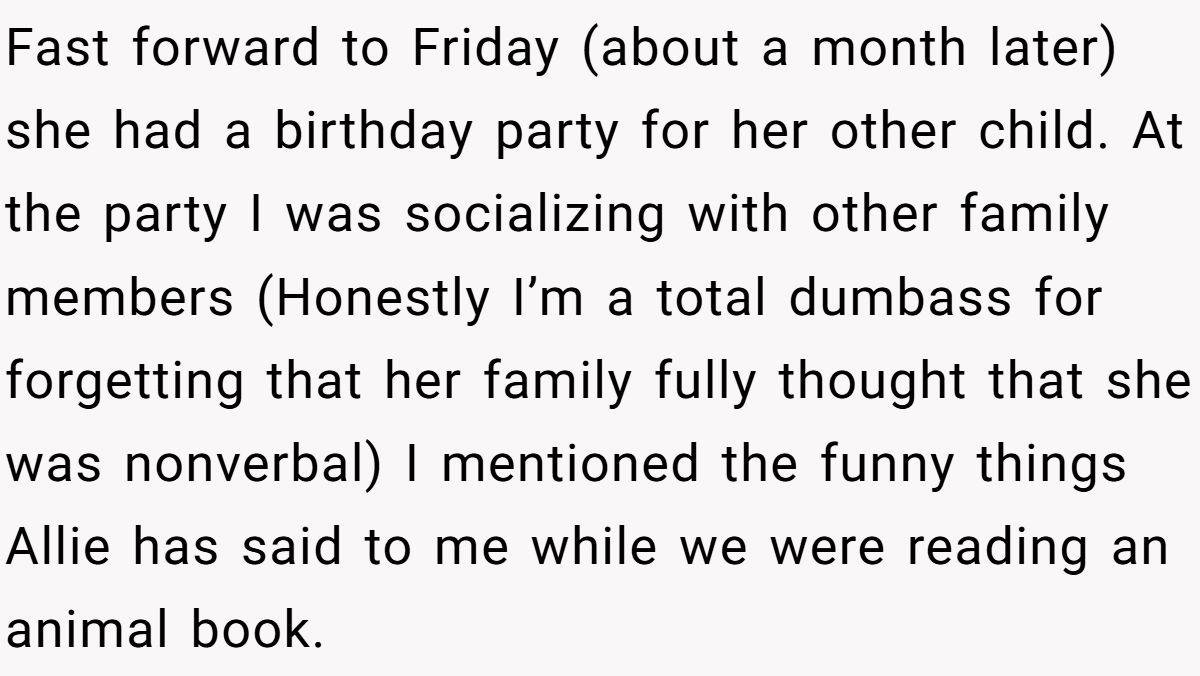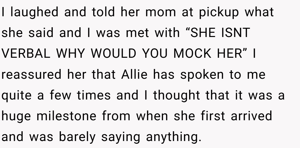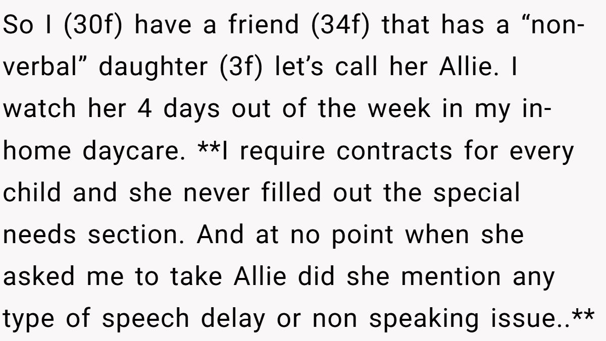 Reddit user u/obviouslytraumatized (30F) runs an in-home daycare where one of her clients, a 3-year-old girl named Allie, attends four days a week. Allie’s mom told everyone—including her—that Allie was nonverbal. But in a twist worthy of a parenting podcast, OP had a voice recording of Allie casually chatting about animals and making jokes. When she played it to defend herself at a party, the mom didn’t cheer—she erupted.
