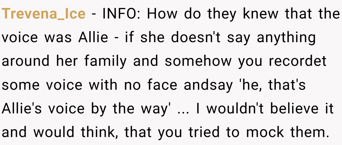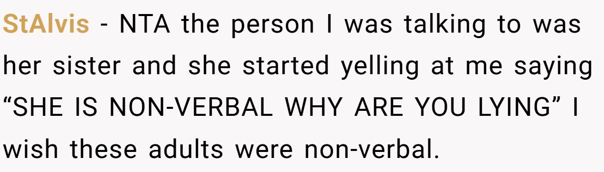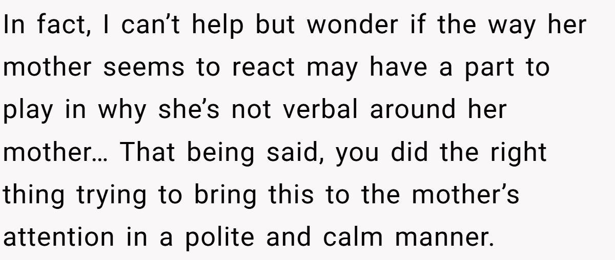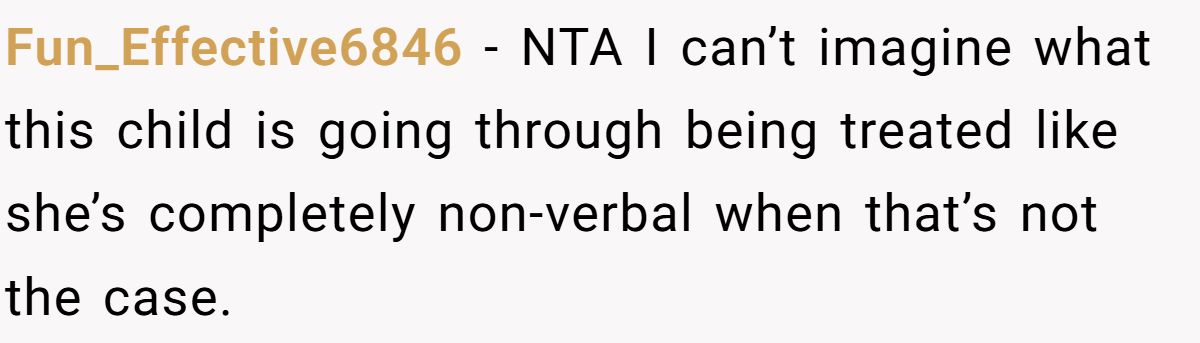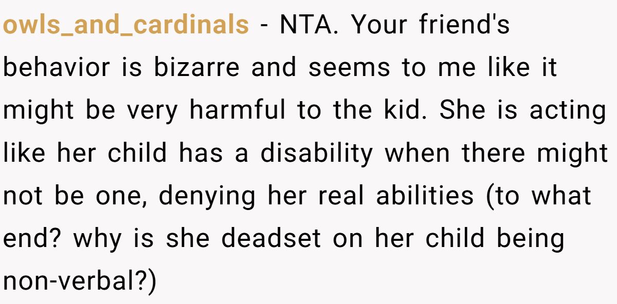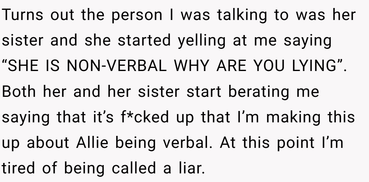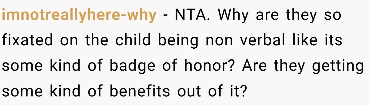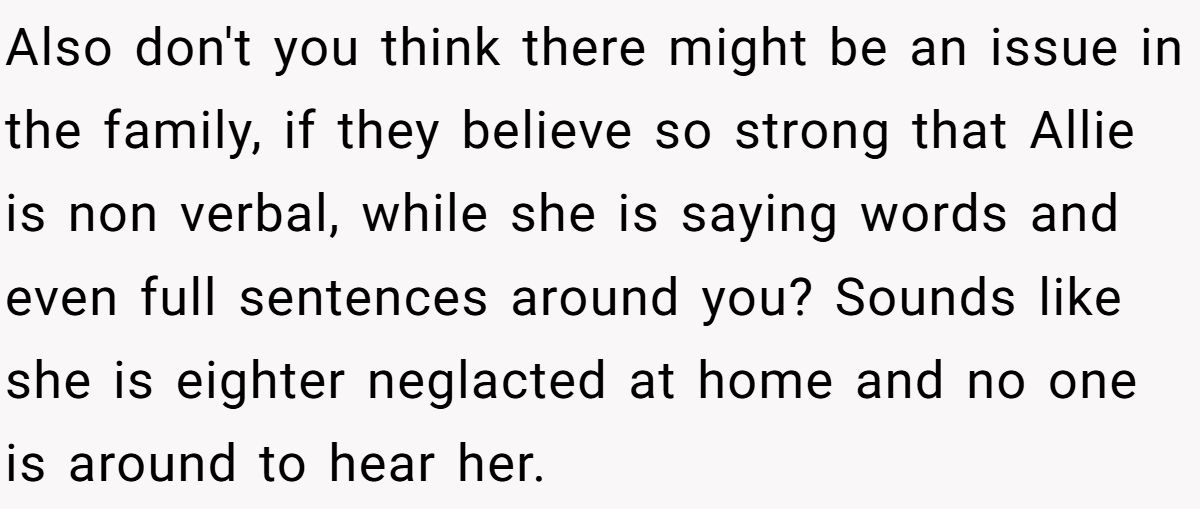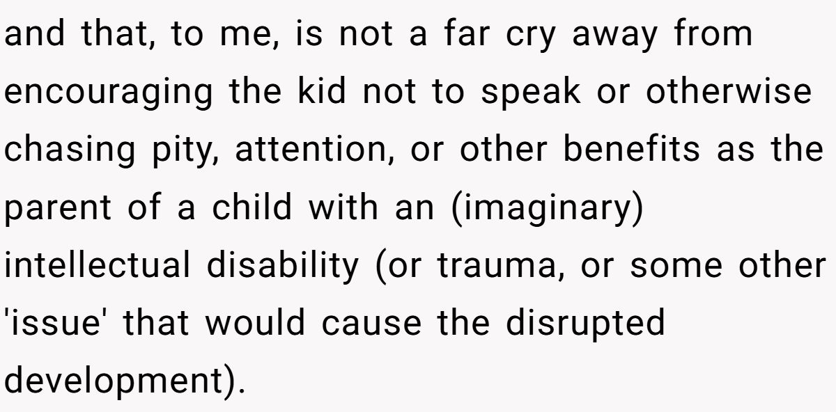 The mom’s reaction could stem from denial, embarrassment, or a more concerning issue: the possibility of over-identifying with a diagnosis. While it’s unclear whether Allie has been formally diagnosed with a speech delay or autism spectrum disorder, the mother’s insistence on maintaining a narrative of nonverbalism despite evidence to the contrary sparked concern from commenters—and rightly so.