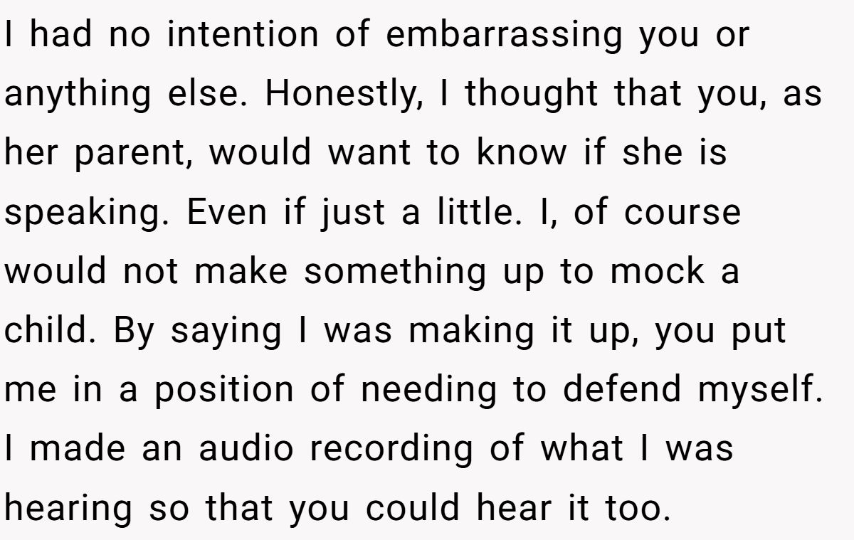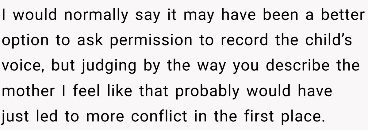 That said, the Redditor’s move wasn’t flawless. Playing a recording of someone’s child—without consent—at a public gathering, even defensively, toes a moral and legal gray area. According to child care law specialists at DaycareLaw.com, voice recordings aren’t strictly illegal if no identifying video or breach of contract occurs, but they are often considered “unprofessional” unless used for safety or documentation purposes.