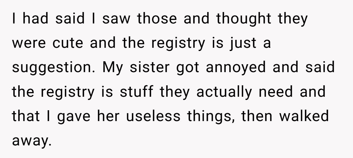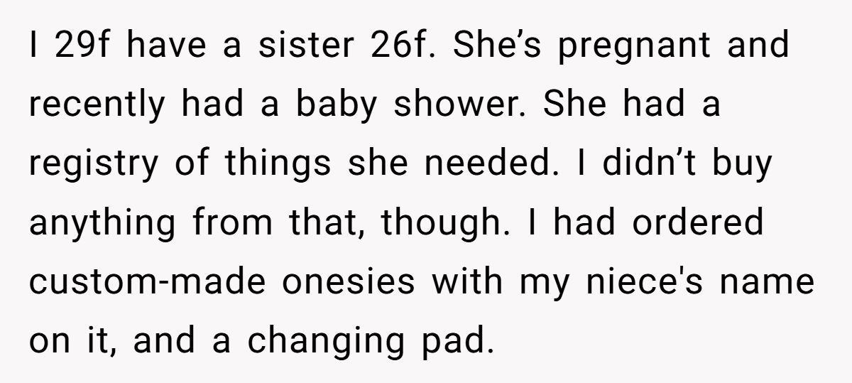 A 29-year-old woman wanted to do something sweet for her pregnant sister. Instead of buying something off the baby registry, she went with a more personal gift: adorable custom onesies and a changing pad. Thoughtful, right? Not according to her sister, who pulled her aside after the baby shower and told her the gift was useless.